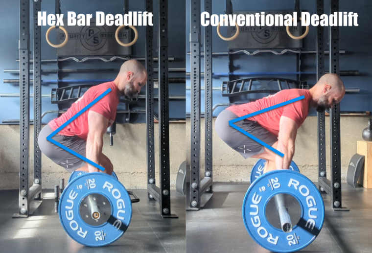 The hex bar deadlift (or trap bar, if you prefer) differs from a conventional deadlift in two meaningful ways. The first is that the shape of the bar allows for a more natural posture than with a standard deadlift. When using a standard barbell, your shins need to be pressed back toward vertical for the bar to stay in line with your center of gravity. Pressing your shins back results in a higher hip position and a very posterior chain, back-focused exercise.
